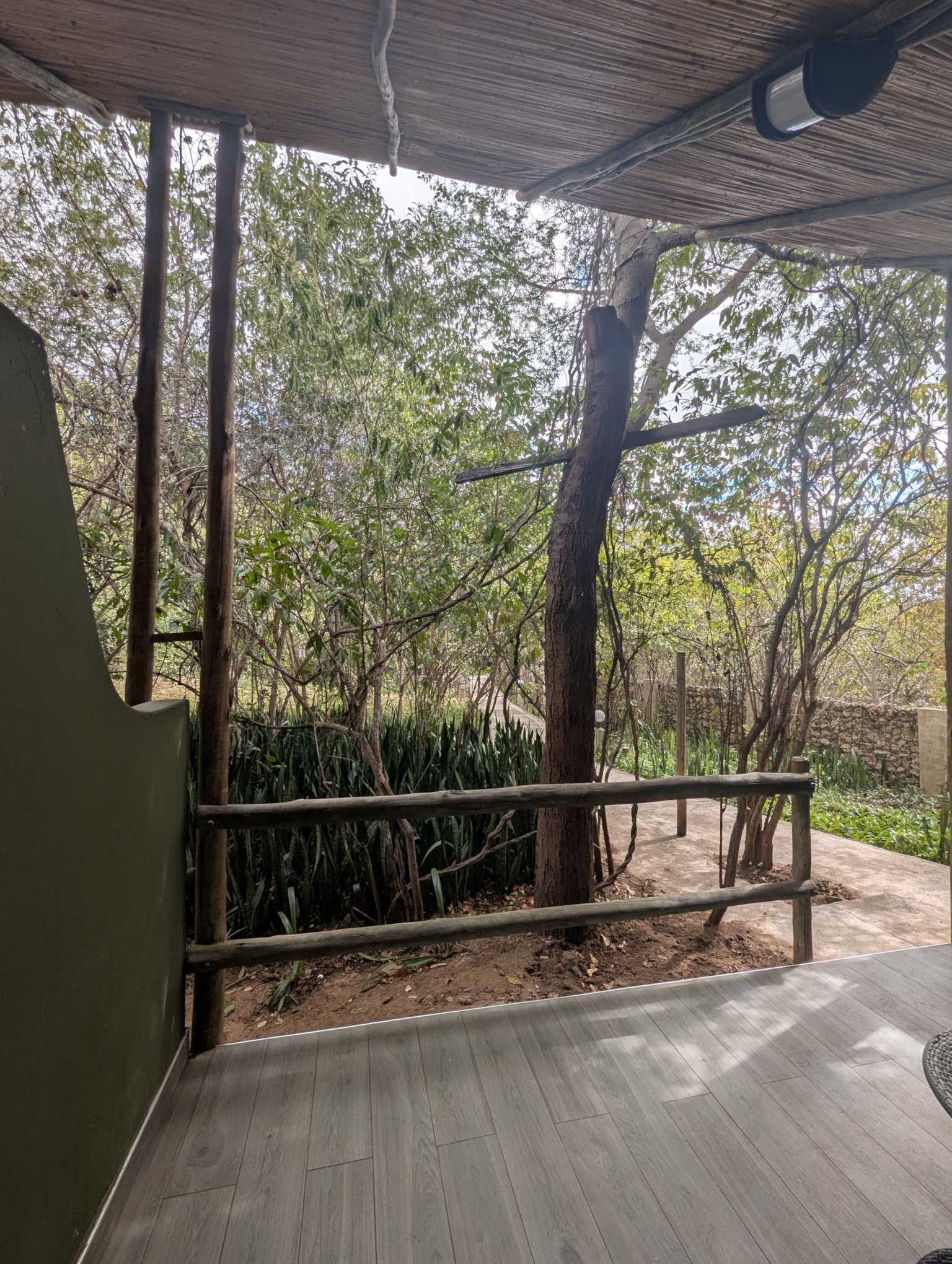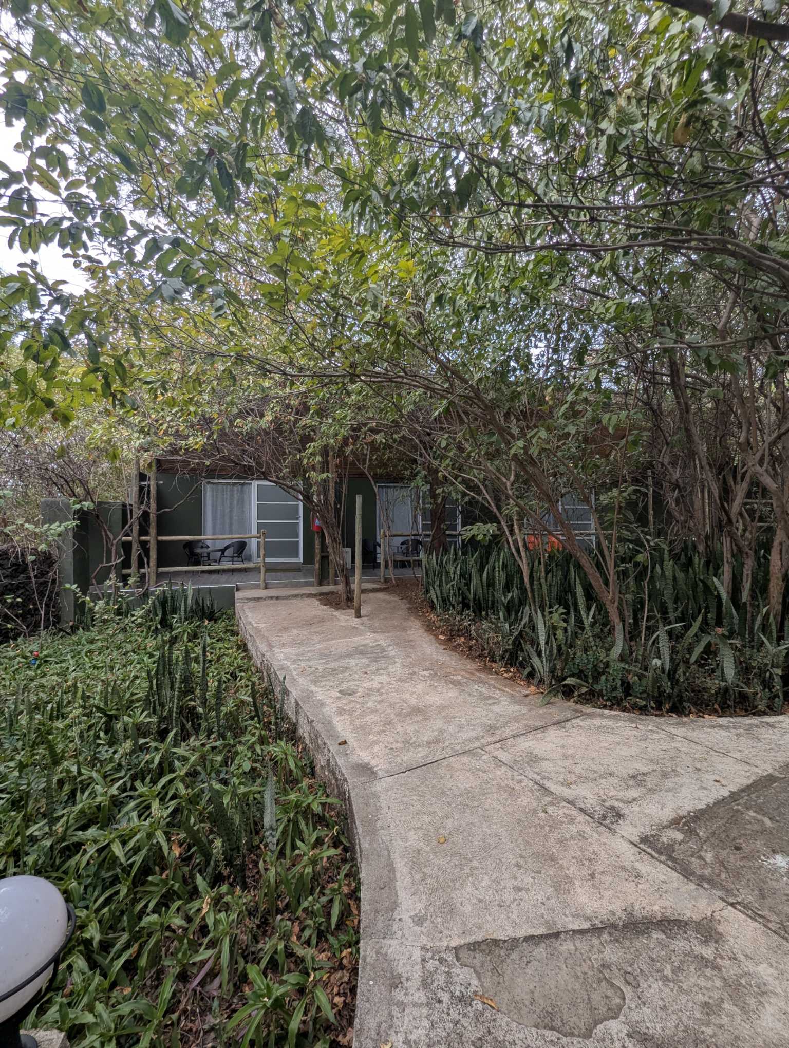 Her har de virkelig lagt vekk på at vi skal bo i jungelen. Det er smale stier og tett i tett med skog, så man ser knapt nabobygningene bare noen meter unna.