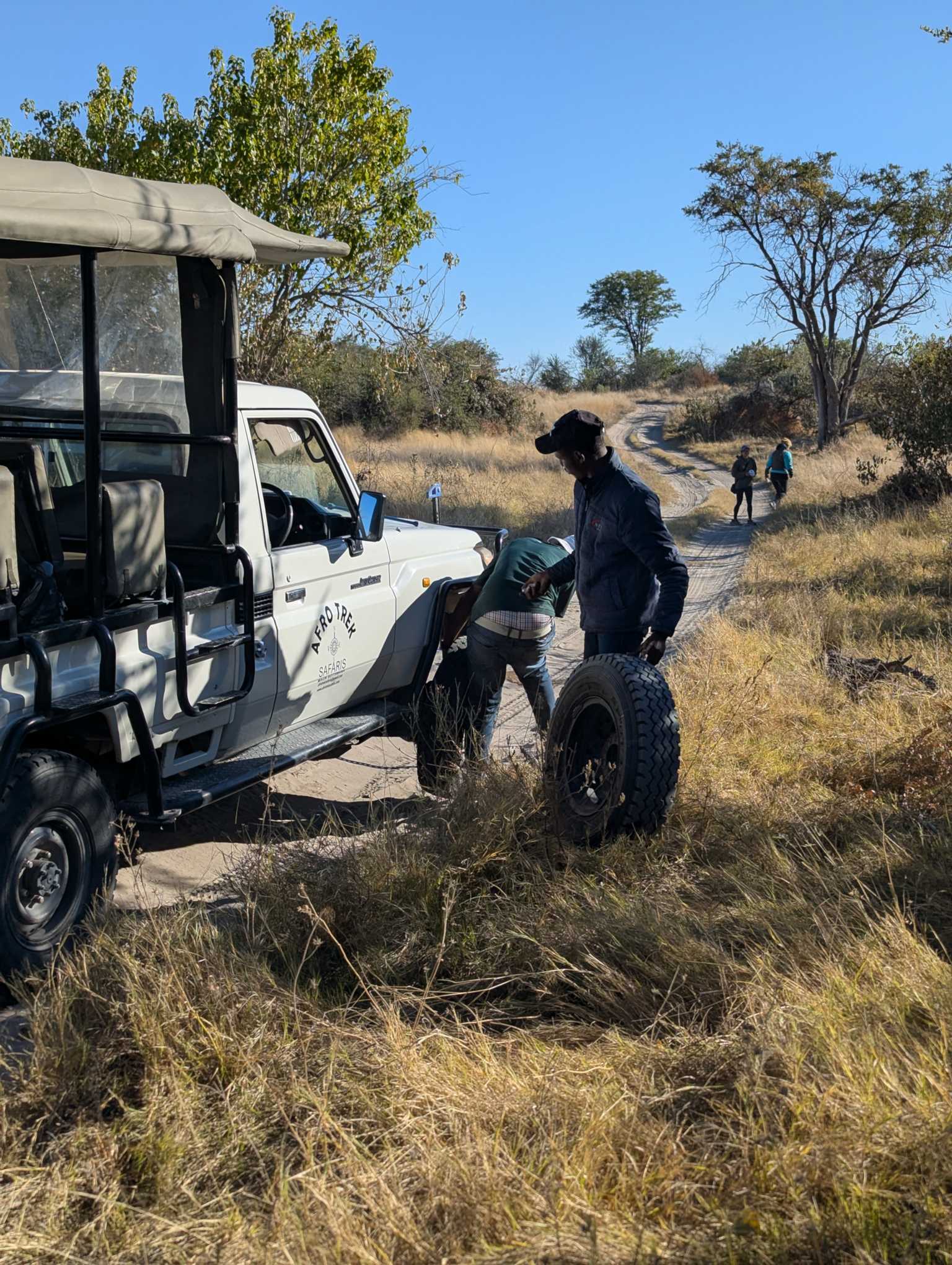 Det ble bokstavelig talt en litt humpete start på turen inn til deltaet. Først mistet vi forhjulet på bilen vår og måtte vente til de kom med erstatningsbil. Så, når vi var kommet et stykke inn i bushen, punkterte sannelig den andre bilen. Sjåførene var raske til å bytte hjul, men vi mistet fort en halvtime.
