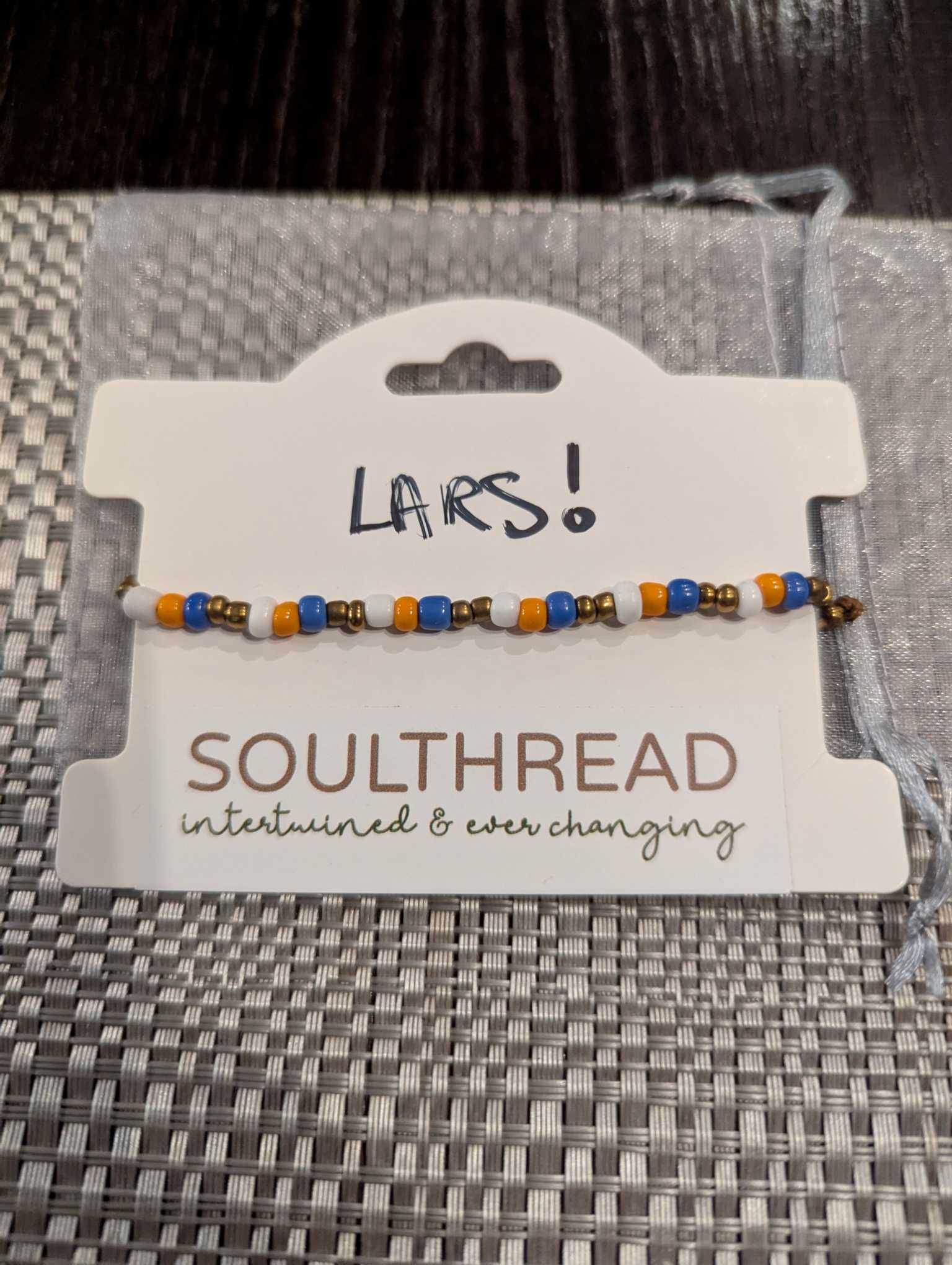 4 av de 15 i turfølget forlater oss i dag, så nå er vi 11 personer som fortsetter videre i Namibia og Sør-Afrika. Reiselederen bruker alltid å gi en liten avskjedsgave til de som reist med henne, så den fikk alle ved middagen, også vi som fortsetter turen. Gaven er et lite armbånd som er laget av noen lokale (Sør-Afrikanske) kunstnere.