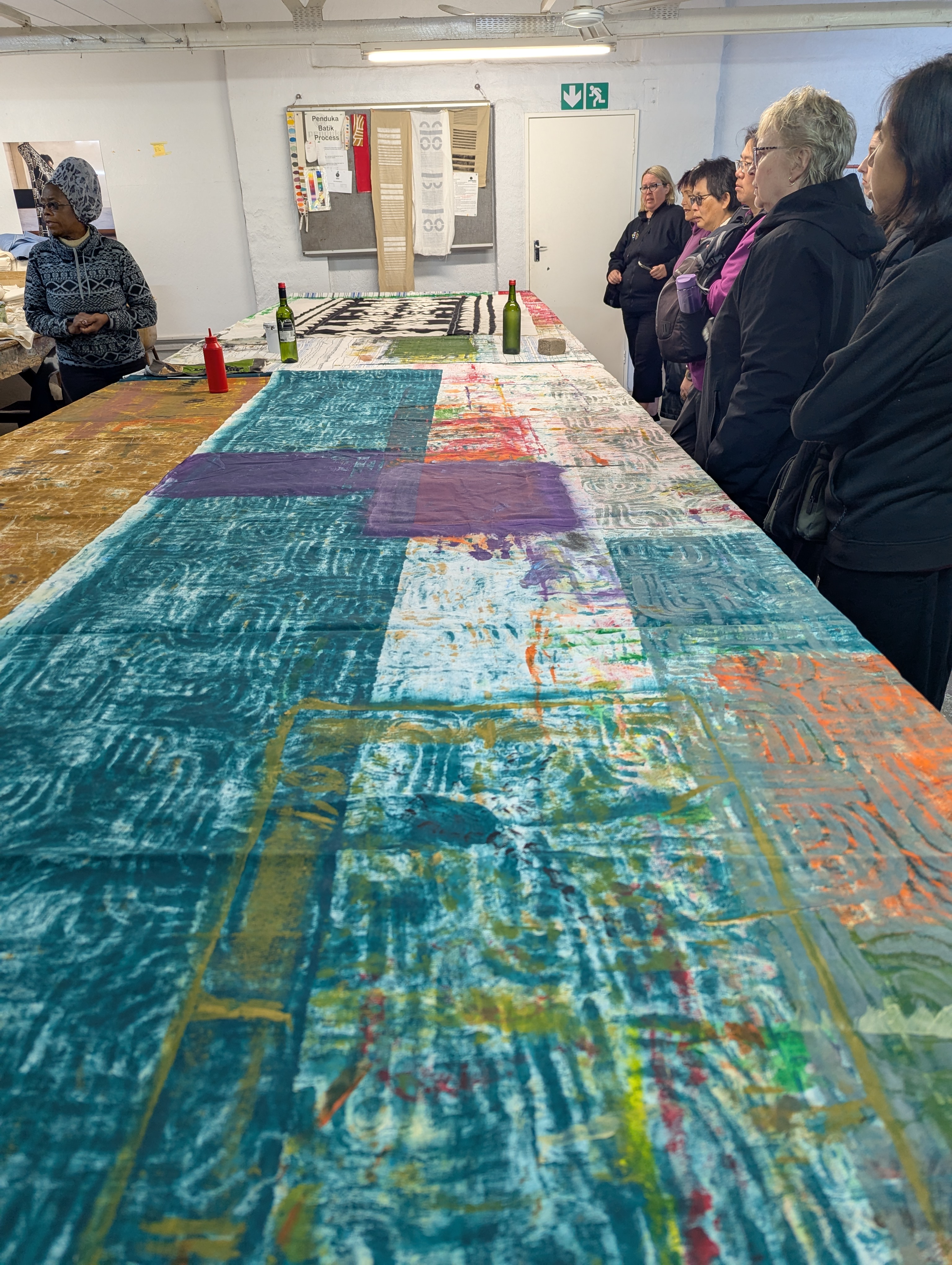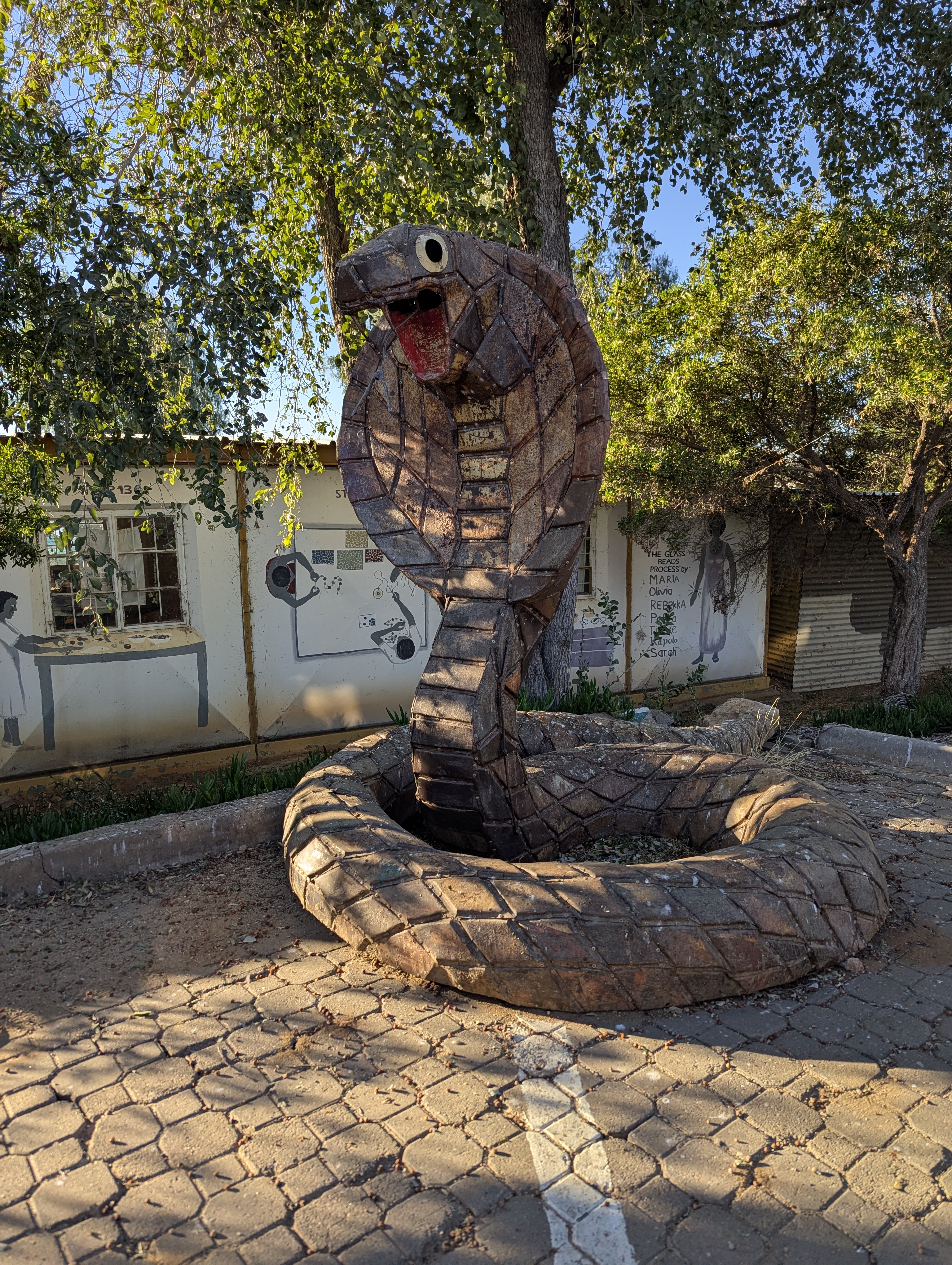 Fra Windhoek ble det ny reisedag, men med en innlagt omvei. Vi reiste via Penduka Village, som er et arbeidsfellesskap/kunstkollektiv for kvinner. Målet er at de skal være selvstendige og uavhengige. Det startet for mange år siden med 5 kvinner, i dag er de ca 170. I tillegg er det 2 menn, 1 er sjåfør og 1 er vaktmester. Mye av materialene de bruker er basert på gjenbruk. De lager sine egne perler av glass, der de starter med å knuse glassflasker. Dette er jo bråkete arbeid, så det er noen som allerede er døve som utfører det. Etter å ha knust glasset til et fint pulver, varmes det i egne former i flere timer, og ut derfra kommer det så perler som pusses og pusses og pusses til de skinner. De har også egne batikkmønstre, og utstyr for å trykke både på smått og stort.