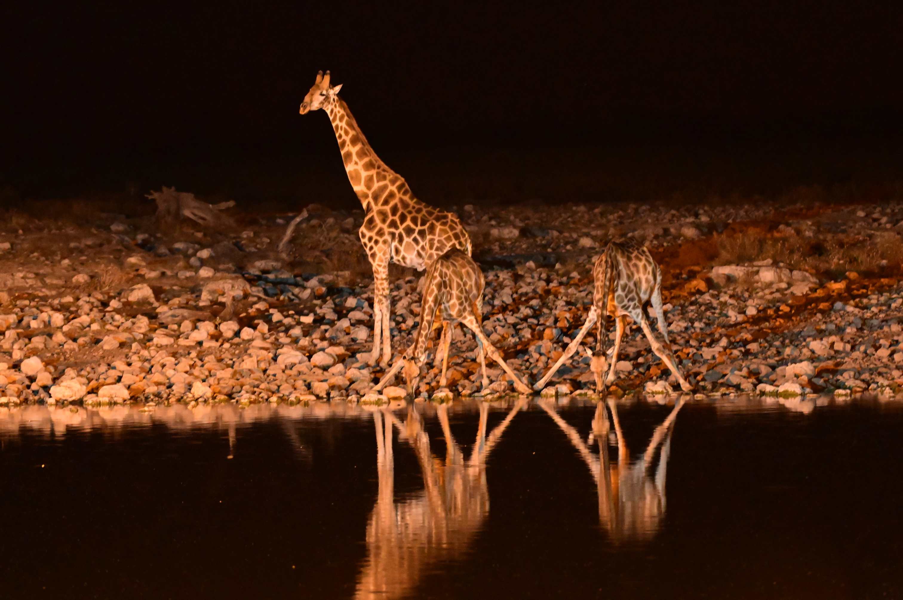 Kvelden ble tilbragt ved vannhullet i campen, og der dukket det opp både giraffer og neshorn utpå kvelden. Beklager fargen på bildene, de hadde et par svære lyskastere med orange lys, så da ble det orange bilder.