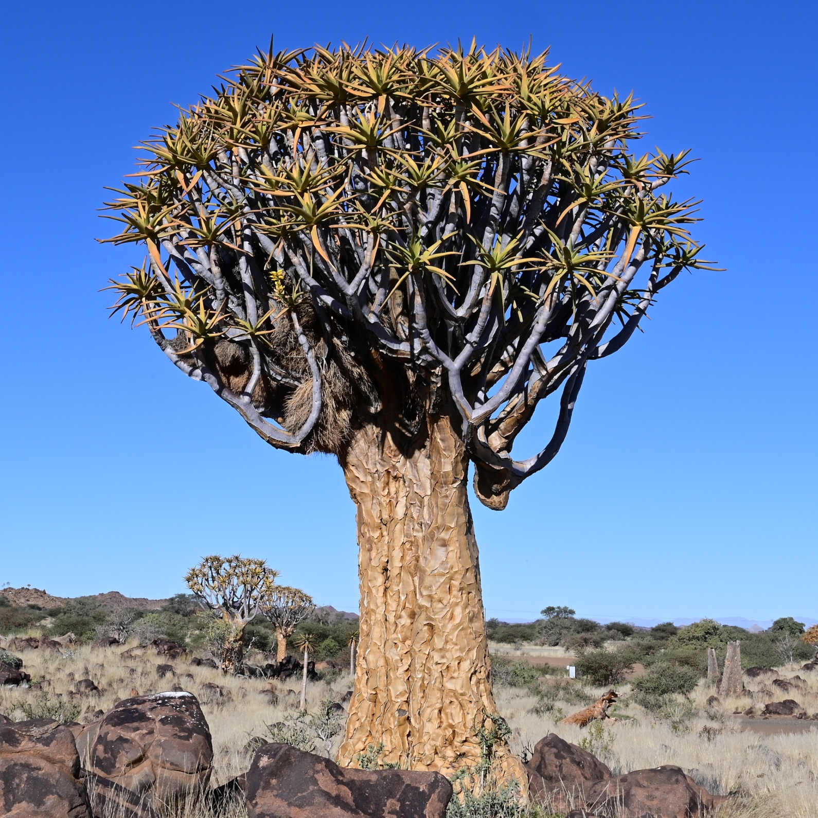 Fra lekegrinda var det ikke lange veien til Quiver Forest. Det er litt langt mellom trærne, så ville kanskje ikke kalt det en skog hjemme i Norge. Disse trærne blir brukt av san-folket til å lage kogger for piler og andre gjenstander. Veldig spesiell tresort som har et hardt lag like innenfor barken, og resten er som gress. Trærne vokser svært sakte, de fleste i området vi besøkte var 2-300 år gamle, og bare 5-7m høye. Det latinske navnet er Aloe dichotoma, lokalt kaller de det kokerboom, som betyr kogger-tre på afrikaans