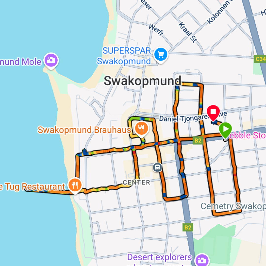 Swakopmund er en veldig oversiktlig by. Gatene i sentrum går enten nord-sør eller øst-vest. Så lenge du vet hvor havet er, er det veldig enkelt å finne fram.